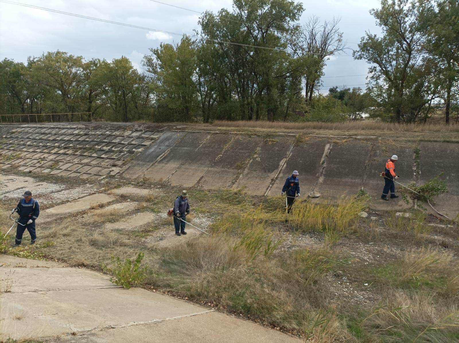 В Раздольненском филиале ГБУ РК «Крыммеливодхоз» согласно плана ремонтно-уходных работ на 2025 год проводятся работы по окашиванию и вырезке от сорной растительности напорного бассейна насосной станции № 13А силами осмотрщиков и рабочих по комплексному обслуживанию и ремонту зданий Раздольненского участка оросительных систем.