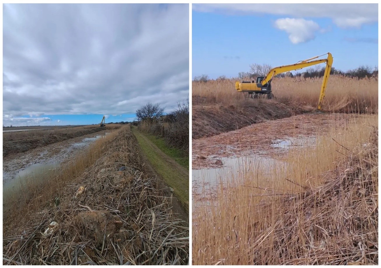 Красноперекопский филиал, в соответствии с планом ремонтно-уходных работ на 2026, выполнил работы по очистке дна канала С-1 от камышовой и кустарниковой растительности и наносов. Мероприятия выполнены работниками филиала механизировано с помощью экскаватора XCMG XE210WB.