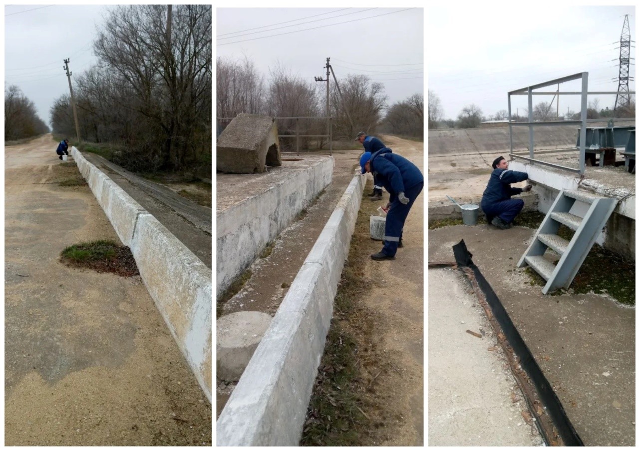 На головном гидротехническом сооружении Соединительного канала силами работников филиала были выполнены уходные работы по побелке элементов ГТС и прилегающего бордюрного ограждения.