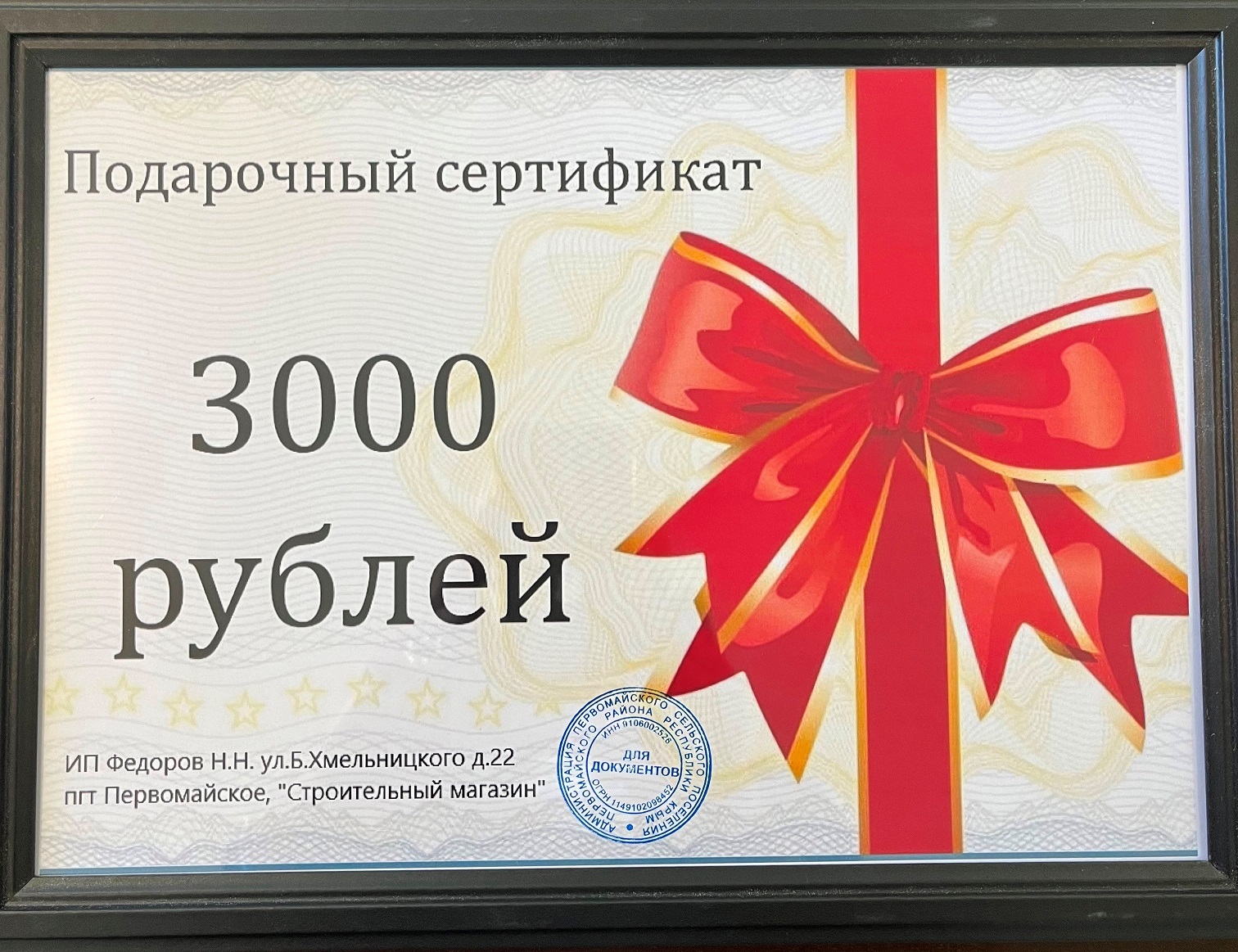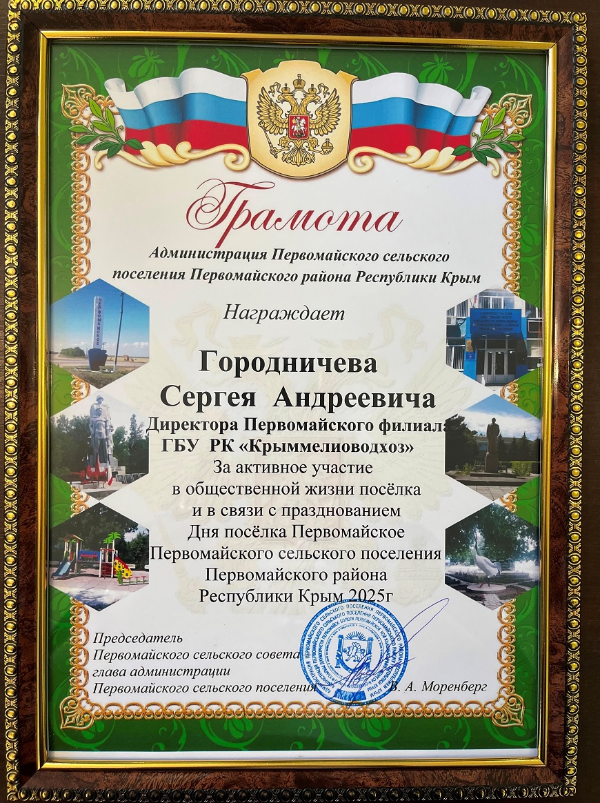 В рамках празднования Дня государственного флага России 22 августа 2025 года и в связи с празднованием Дня поселка Первомайское, Первомайскому филиалу ГБУ РК «Крыммелиоводхоз», за активное участие в общественной жизни поселка и оказание постоянной помощи в благоустройстве поселка Первомайское, вручены - Почетная грамота и Подарочный сертификат от Администрации сельского поселения Первомайского района Республики Крым.